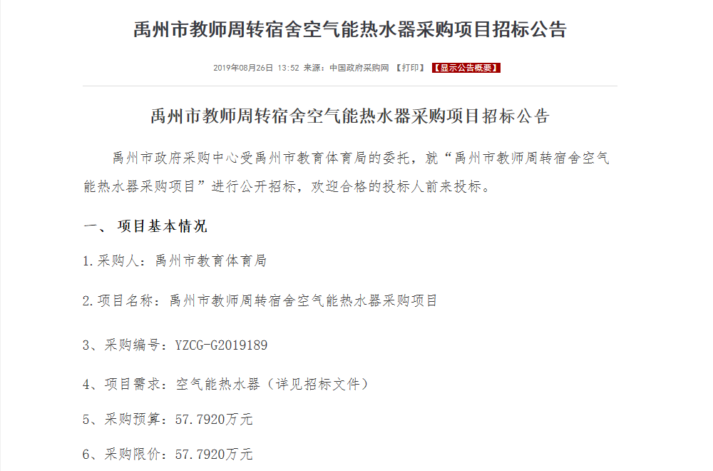 【公告】禹州市教師宿舍空氣能熱水器項目招標,正旭廠家積極投標