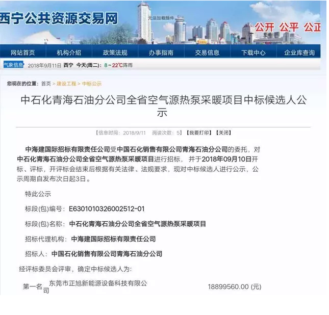近日,中石化青海石油分公司全省空氣源熱泵采暖項(xiàng)目中標(biāo)名單出爐,正旭空氣能成功中標(biāo)。中國(guó)石化銷(xiāo)售有限公司青海石油分公司作為招標(biāo)人委托中海建國(guó)際招標(biāo)機(jī)構(gòu)進(jìn)行了嚴(yán)謹(jǐn)招標(biāo)工作,眾多熱泵企業(yè)同標(biāo)競(jìng)爭(zhēng),正旭空氣能成為三家中標(biāo)企業(yè)的第一名。