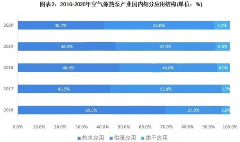 氣源熱泵應用領域包括熱水市場、供暖市場、工農業烘干市場三個主要市場,其中熱泵熱水市場和熱泵采暖市場占了市場的絕大部分且競爭激烈,所占比例之和連續三年超過90%。