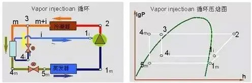 為突破這一難題,眾多熱泵廠商聯(lián)合壓縮機供應(yīng)商進行技術(shù)攻關(guān),最終找到“噴氣增焓”這一突破口,成功將空氣源熱泵市場往北方推進一大步。這種思路的核心出發(fā)點是:通過二級或多級壓縮實現(xiàn)壓縮比分解,以此降低每級壓縮機的壓縮比,從而提高每級內(nèi)容積比效率,降低排氣溫度,有效改善低溫環(huán)境下機組的制熱性能。