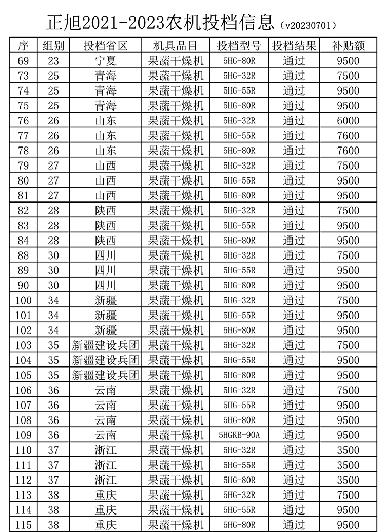值得一提的是,正旭5HG-32R、5HG-55R、5HG-80R、5HGKB-90A四款果蔬烘干機成功進入安徽、甘肅、廣西、貴州、海南、河北、河南、湖北、吉林、江蘇、江西、遼寧、寧夏、青海、山東、山西、陜西、四川、新疆(含新建建設兵團)、云南、浙江、重慶22個省市自治區農機補貼目錄,使用正旭熱泵烘干機最高可享受9500元農機補貼款,這已是正旭連續多年進入各地農機補貼目錄。