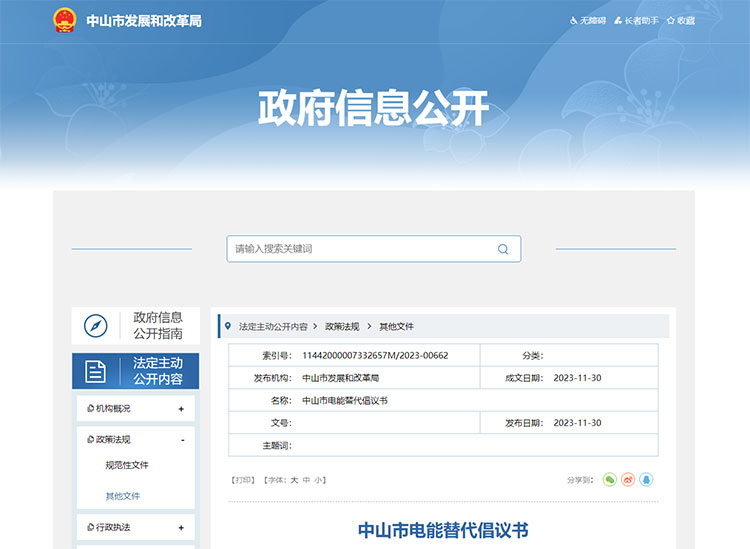 為持續推進電能替代,在終端能源消費環節實施以電代油、以電代氣等,增加新能源消納能力,提高全市電氣化水平,擴大電力消費,滿足人民群眾美好生活需要,中山市于近日發布《中山市電能替代倡議書》(以下簡稱“倡議書”), 為促進能源綠色轉型,提升終端用能清潔化、低碳化水平,促進清潔能源消納,助力實現碳達峰、碳中和目標提供助力。